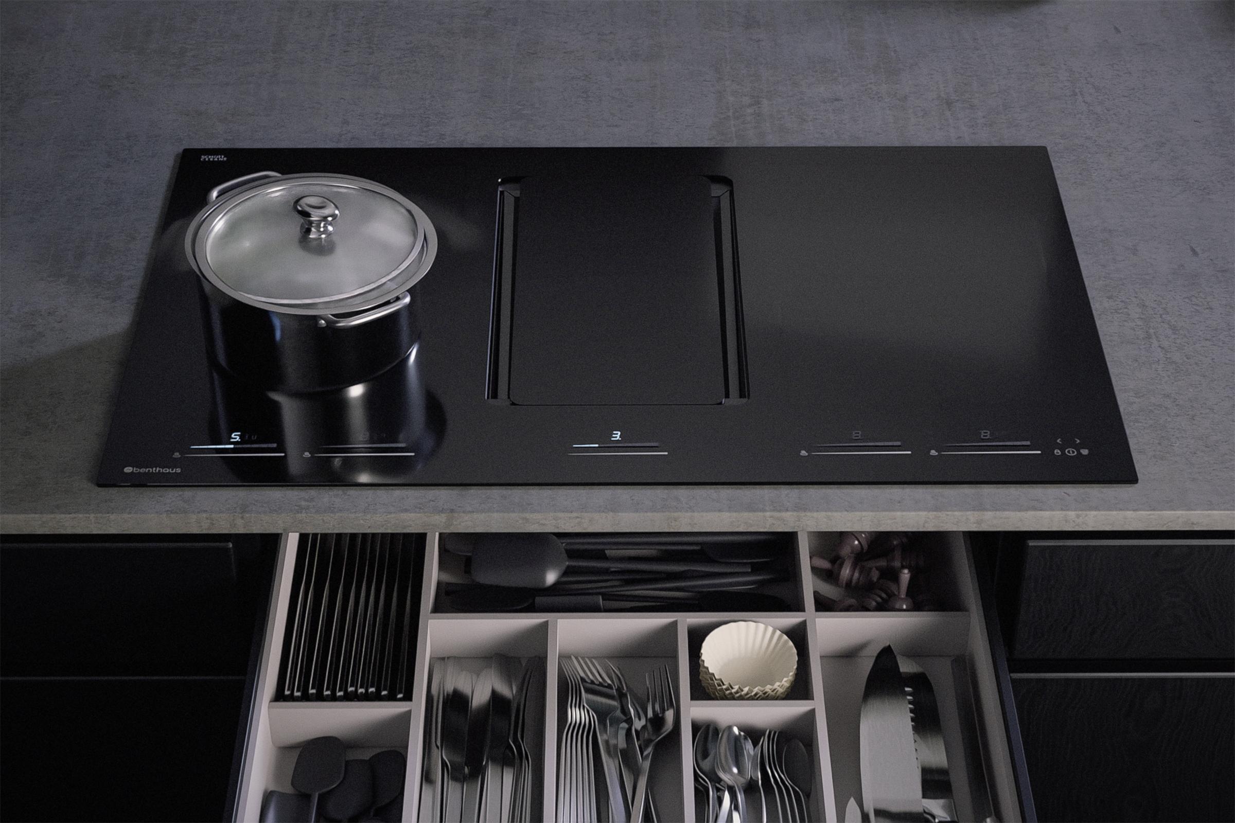 Durch die besonders flache Abluftführung bietet dir unser Muldenlüfter die Möglichkeit, den Stauraum unter dem Kochfeld weiterhin als Schublade nutzen zu können. Somit gewinnst du mehr Stauraum in deiner Küche. Ohne Platz auf dem Kochfeld einbüßen zu müssen.